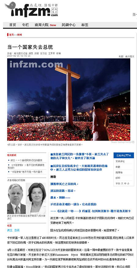 Niezwykły artykuł pojawił się 16 kwietnia 2010 w chińskiej gazecie Nanfang Zhoumo (inteligenckiej, jednej z bardziej niezależnych). Dzięki niemu polska katastrofa stała się dla Chińczyków nauką o demokracji. Na przykładzie Polski autor pokazuje Chińczykom coś, co dla nas jest normalne: Że demokratyczne państwo prawa działa i chroni swych obywateli, nawet w sytuacjach ekstremalnych.